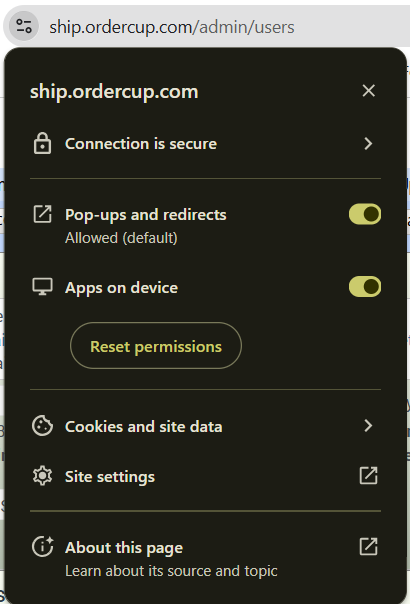Locate the permission related to the application (such as pop-ups, redirects, or access requests)